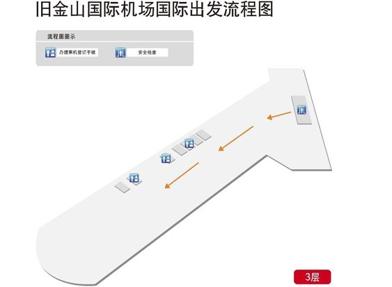 旅客下机进入二层国际到达厅→边防检查→行李提取厅→提取托运行李→海关检查→如是中转旅客按标志前往中转柜台办理中转手续;若终点是旧金山直接前往到大厅